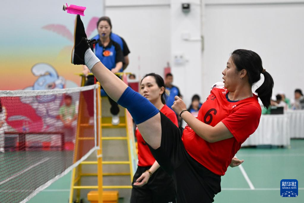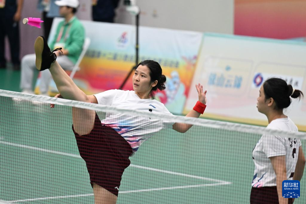 当日,第十二届全国少数民族传统体育运动会毽球女子双人赛第三轮比赛在海南三亚举行。