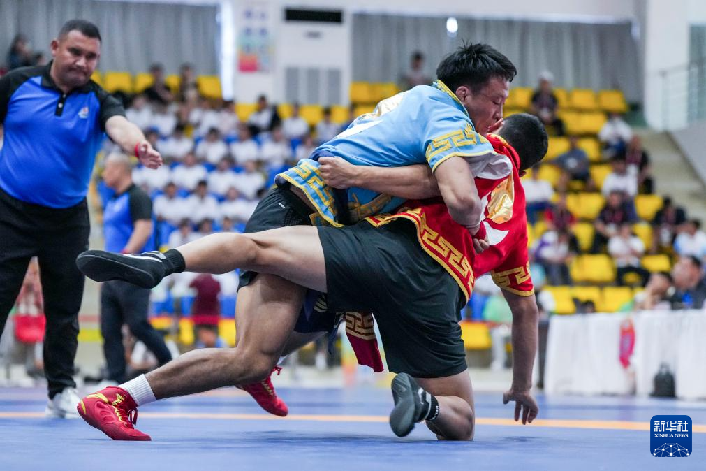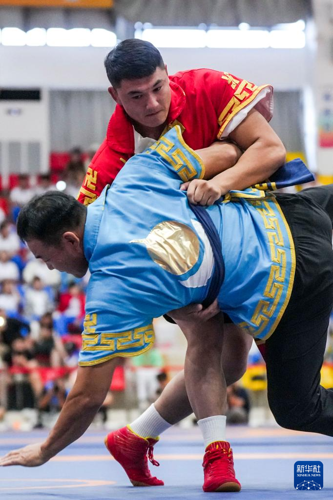 11月27日,天津队选手阿拉腾松布尔(上)与天津队选手乌力吉陶格陶在北嘎87公斤级半决赛中角逐。最终,阿拉腾松布尔战胜乌力吉陶格陶。