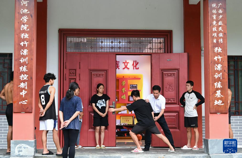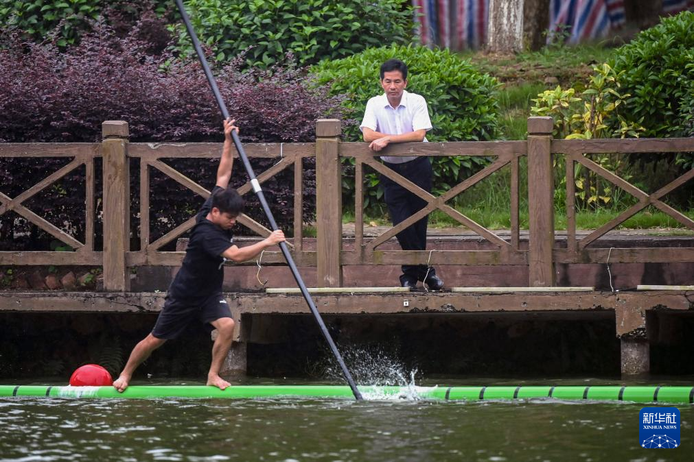 在位于广西河池市的河池学院,该校体育学院院长蓝建卓(右二)纠正独竹漂队队员的技术动作(2024年6月19日摄)。