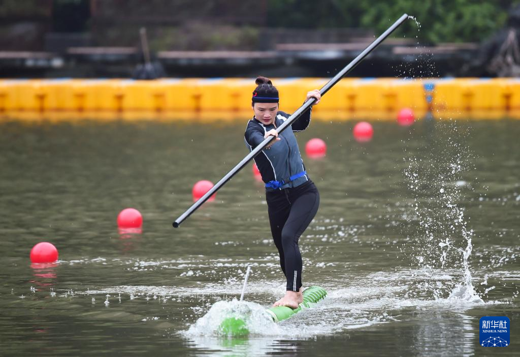 河池学院独竹漂队队员陆春桃在广西桂林市举行的“民族体育炫”系列比赛中参加独竹漂项目的比赛(2019年4月4日摄)。