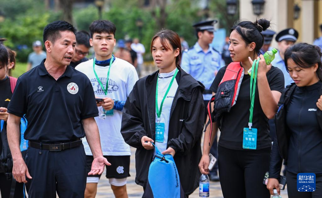 在位于广西河池市的河池学院,该校体育学院院长蓝建卓(右)观看独竹漂队队员的训练。(2024年6月19日摄)。