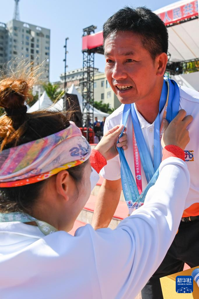 11月28日,在海南三亚举行的第十二届全国少数民族传统体育运动会独竹漂项目全部小项的比赛结束后,广西队独竹漂选手陆春桃为教练蓝建卓(右)戴上奖牌。