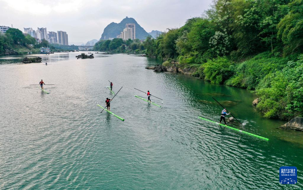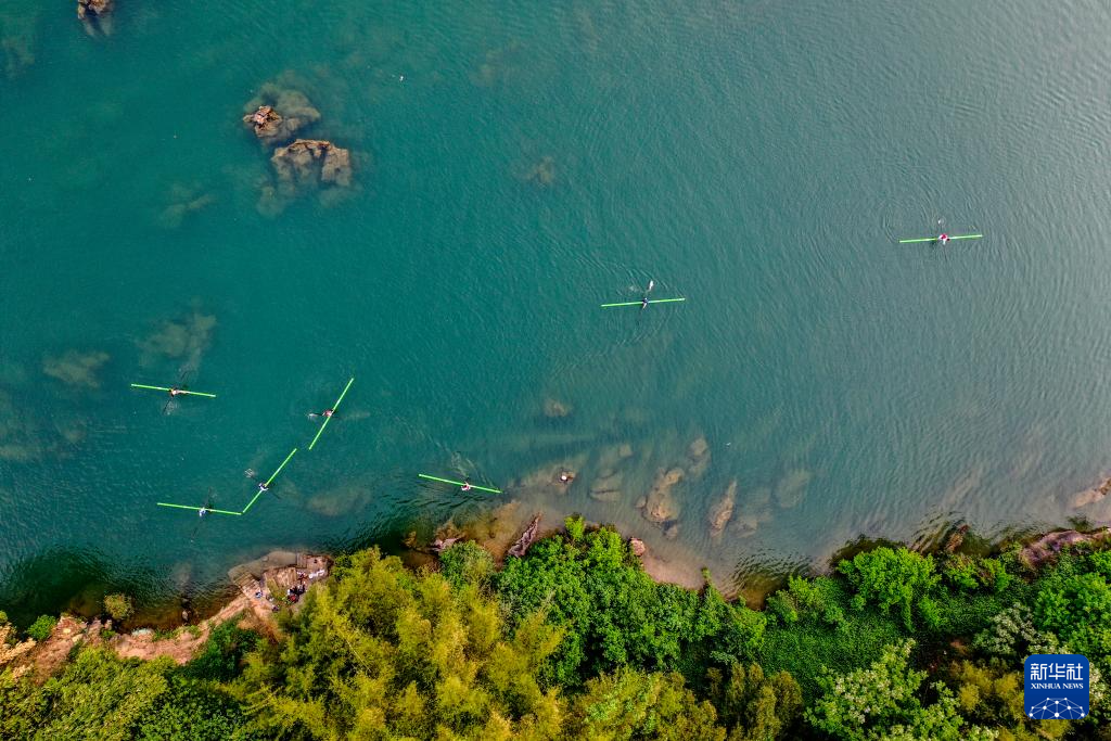 河池学院独竹漂队的队员们在龙江河上训练(无人机照片,2024年4月9日摄)。
