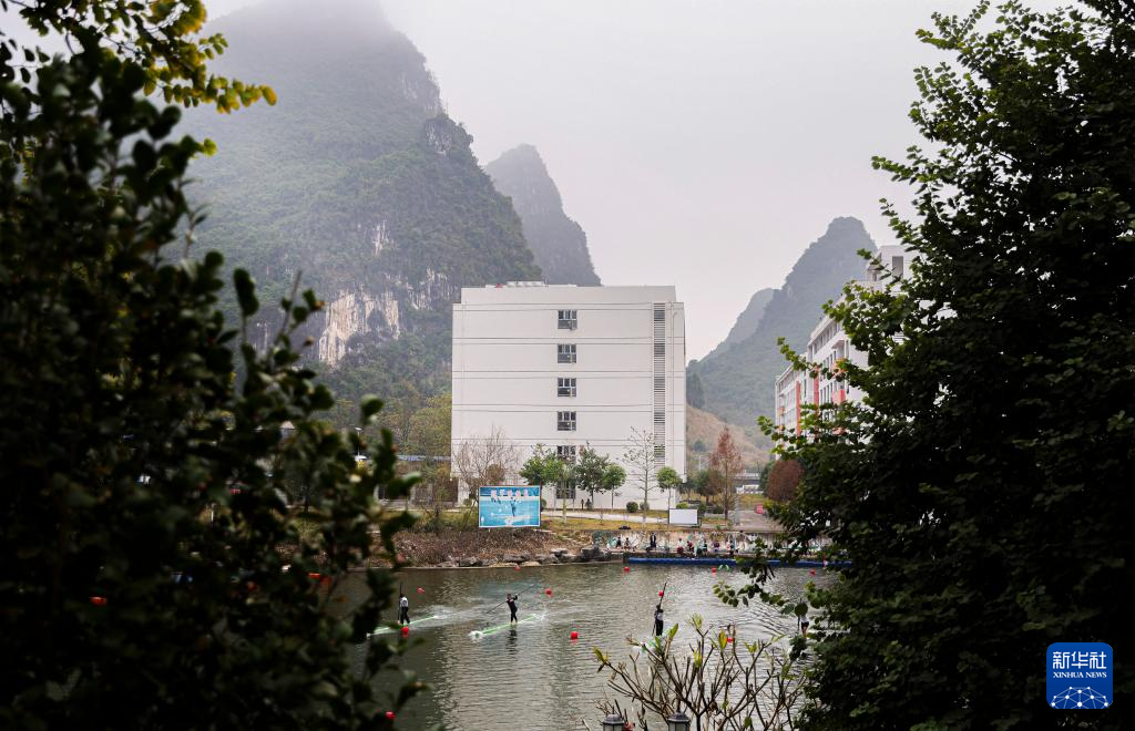 在广西河池,河池学院的学生在校园内练习独竹漂(2024年1月9日摄)。
