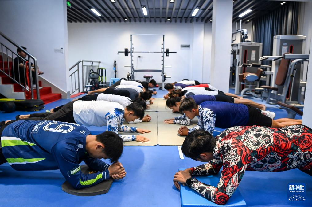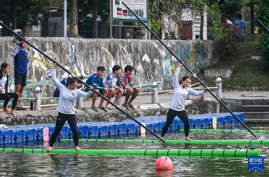 在广西河池,河池学院独竹漂队的队员们进行体能训练(2024年11月14日摄)。