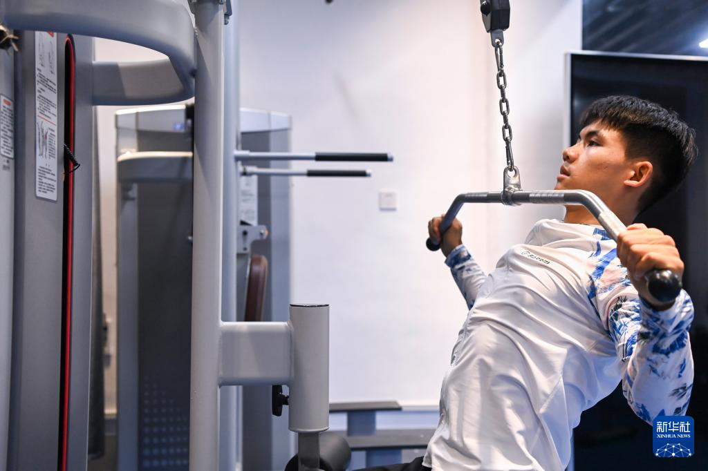 在广西河池,河池学院独竹漂队队员韦炳粤进行体能训练(2024年11月14日摄)。