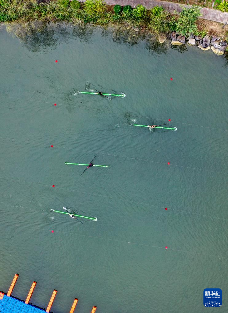河池学院独竹漂队的队员们在学校的训练基地内训练(无人机照片,2024年1月9日摄)。