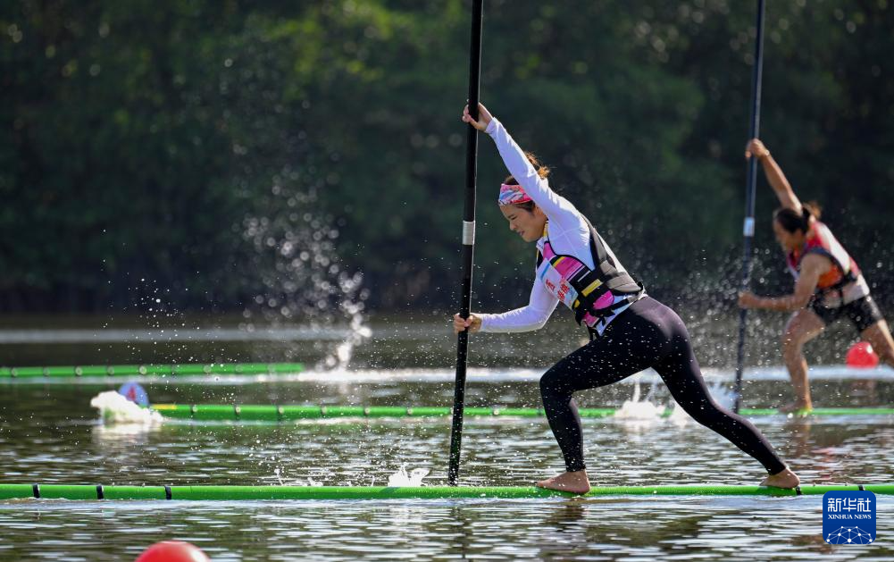 11月28日,广西队选手陆春桃(左)在海南三亚举行的第十二届全国少数民族传统体育运动会独竹漂项目女子组200米直道赛的比赛中。最终陆春桃获得一等奖。