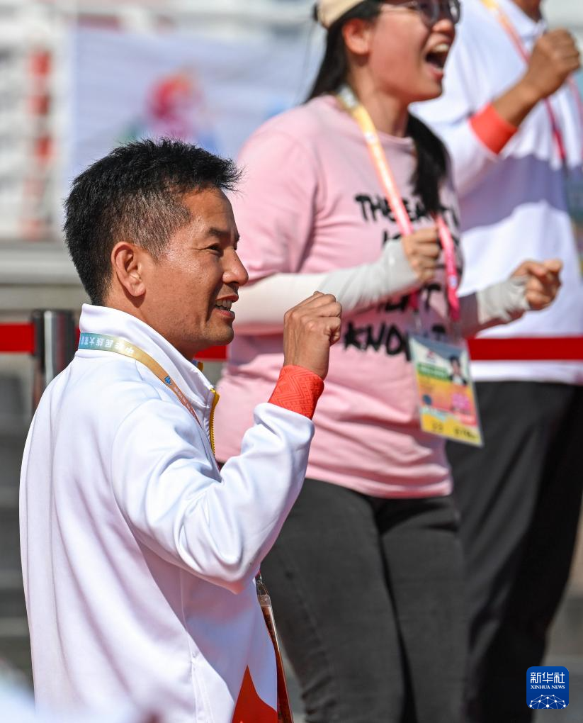 11月28日,广西队独竹漂教练蓝建卓(前)在海南三亚举行的第十二届全国少数民族传统体育运动会独竹漂项目比赛中为选手加油。