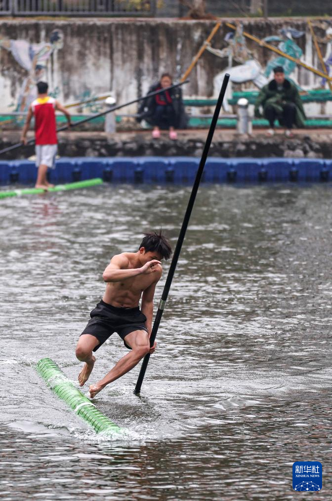 在广西河池,河池学院独竹漂队队员陆季海(前)进行训练(2024年11月14日摄)。