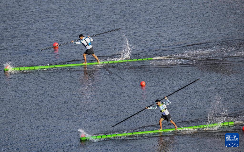 11月27日,广西队选手黄适骥(下)、王光向在海南三亚举行的第十二届全国少数民族传统体育运动会独竹漂项目男子100米直道赛决赛中。最终黄适骥获得一等奖、王光向获得二等奖。