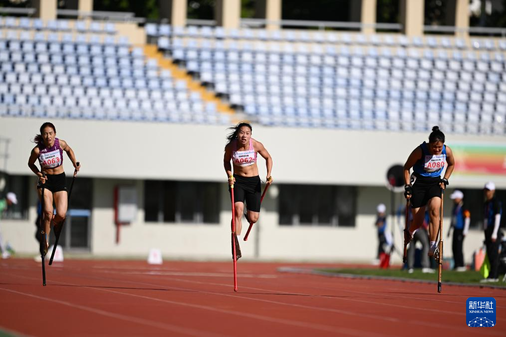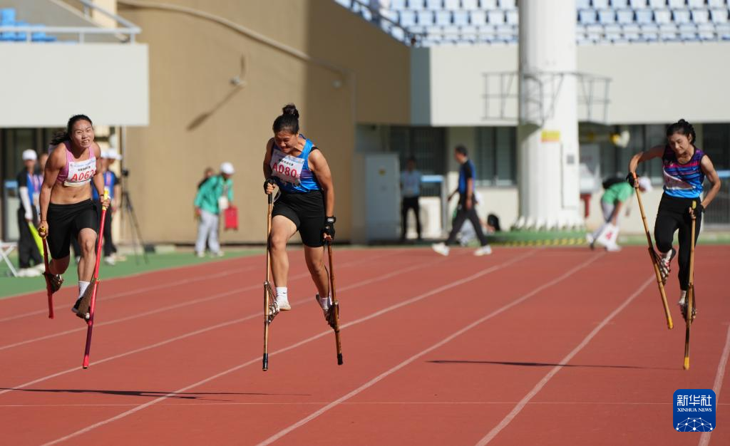 当日,第十二届全国少数民族传统体育运动会高脚竞速女子100米决赛在海南省三亚市举行。