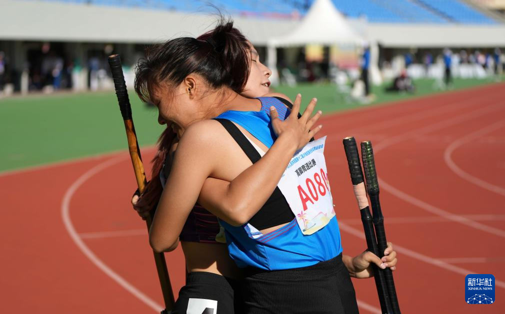 11月29日,海南队选手吴妹娥(前)与湖南队选手严美云在赛后拥抱。最终,吴妹娥获得一等奖,严美云获得二等奖。