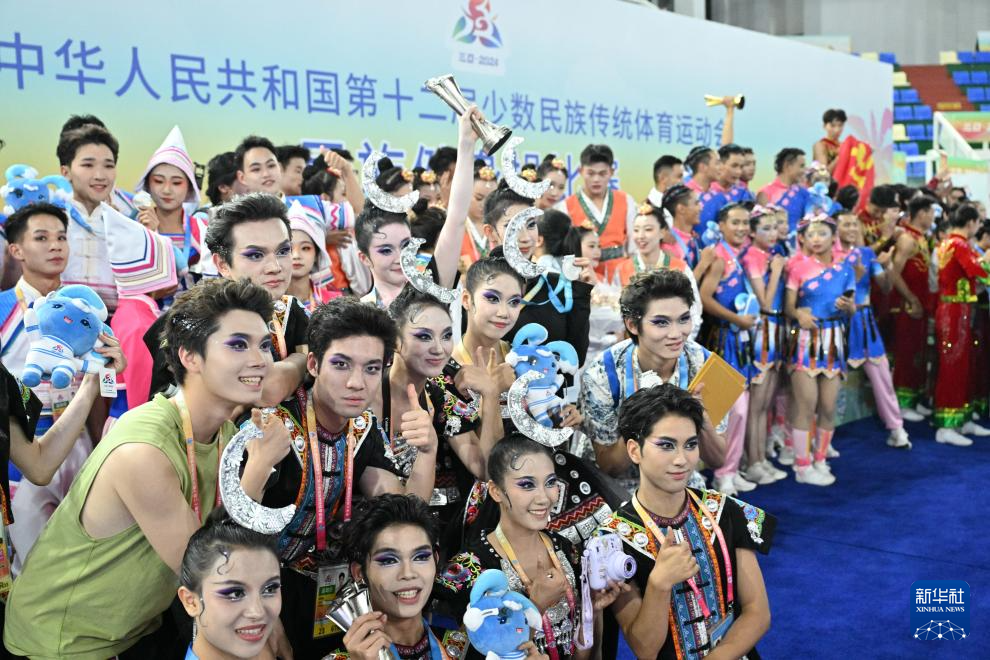 11月28日,这是第十二届全国少数民族传统体育运动会民族健身操自选套路(轻器械)颁奖仪式现场。最终,云南队、海南队、河北队获得二等奖,西藏队获得一等奖,吉林队、福建队、湖北队、辽宁队获得三等奖(从左至右)。