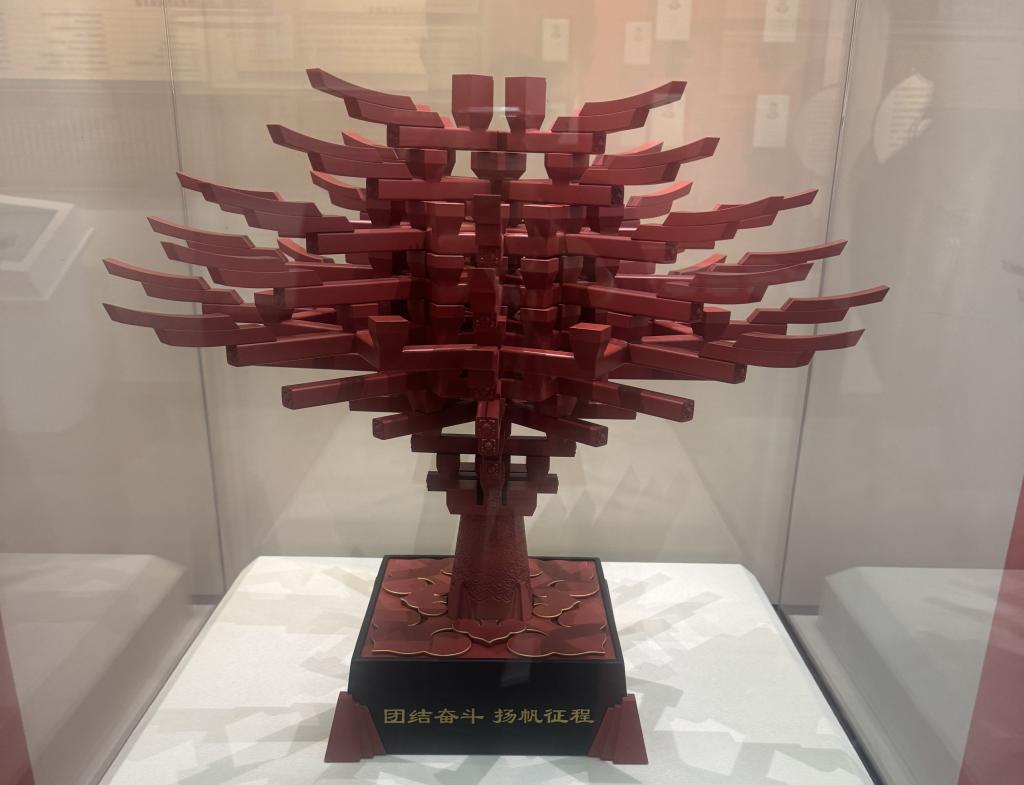 展廊尽头,一棵采用九层榫卯连接、由56个相互支撑的枝杈搭建而成的“華”字民族团结树栩栩如生,象征着各民族休戚与共、荣辱与共、生死与共、命运与共。各民族运动员们如同榫卯,彼此连接、交融,让中华体育文化生机勃勃、昂扬向上。