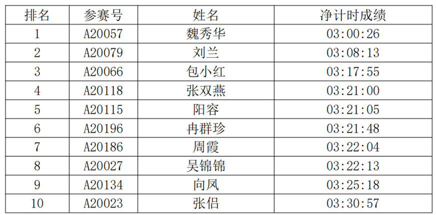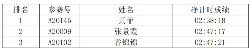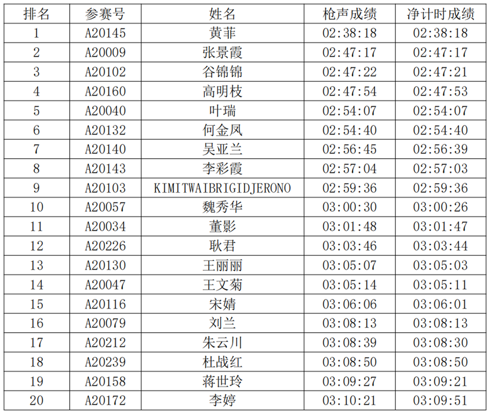 *总成绩女子前三名的选手(按枪声成绩),第四名至二十名的选手按净成绩(芯片成绩)进行排名录取