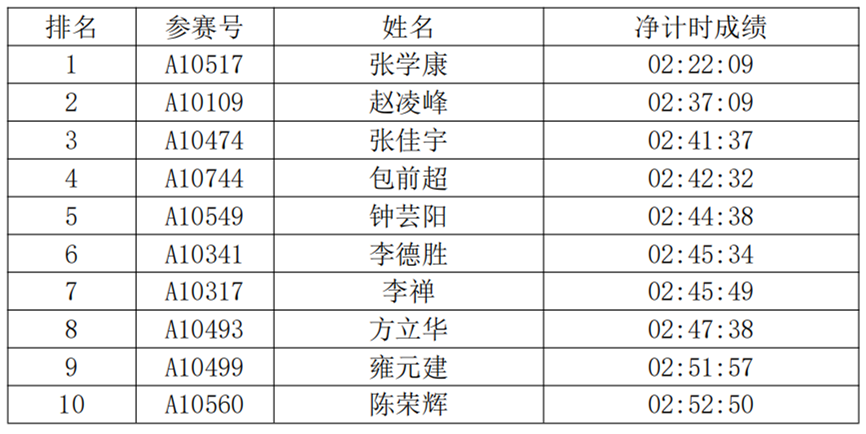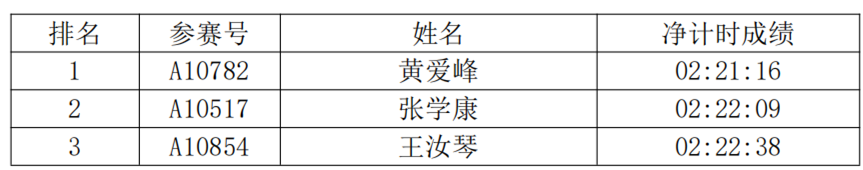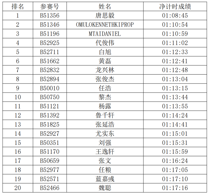 *总成绩男子前三名的选手(按枪声成绩),第四名至二十名的选手按净成绩(芯片成绩)进行排名录取
