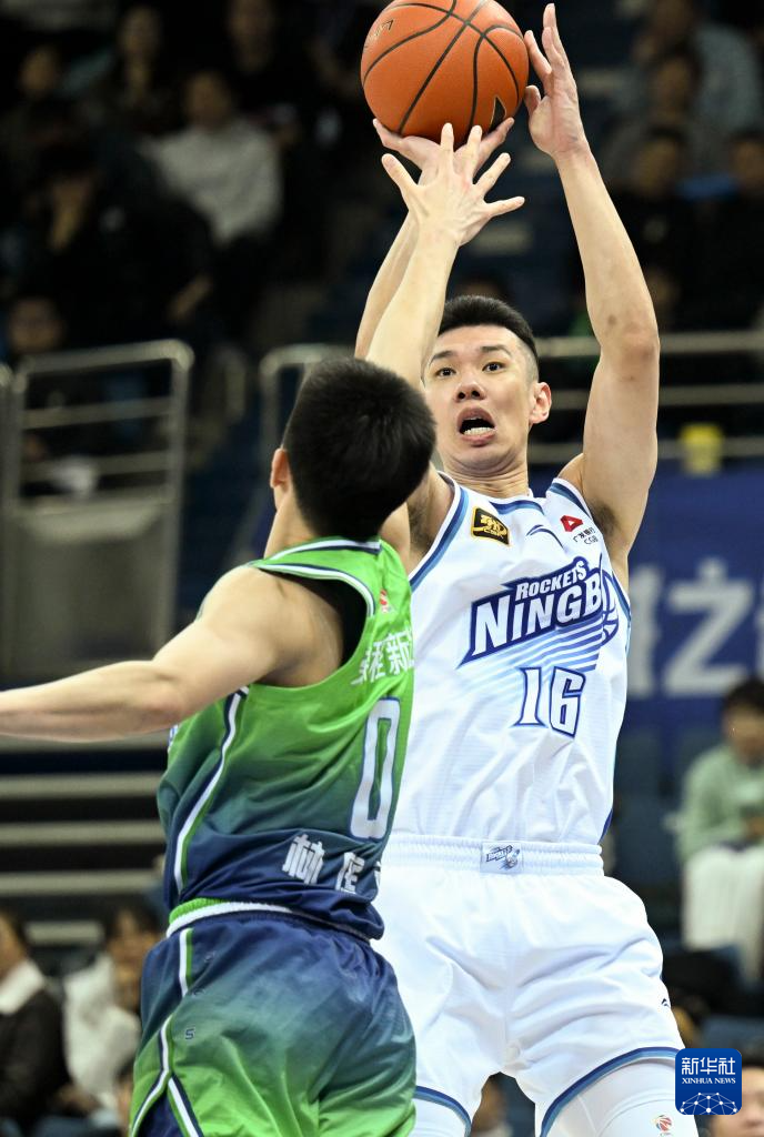 11月29日,宁波町渥队球员罗凯文(右)在比赛中投篮。