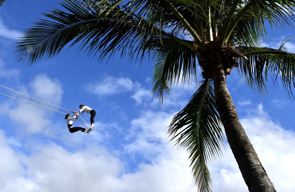 11月24日,上海队组合刘雨诺/张涵瑾(左)在第十二届全国少数民族传统体育运动会秋千55公斤以上双人高度决赛中。新华社记者 王晓 摄