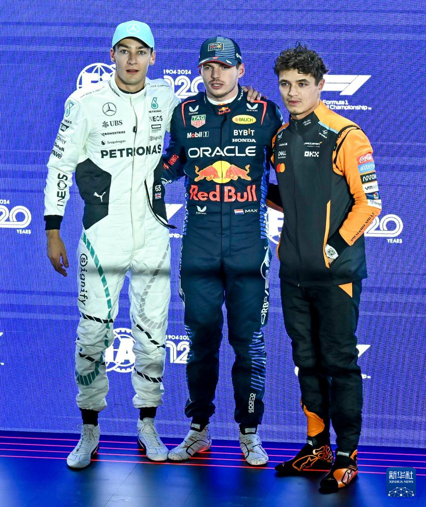 11月30日,红牛车队荷兰车手维斯塔潘(中),梅赛德斯车队英国车手拉塞尔(左)和迈凯伦车队英国车手诺里斯在赛后合影。
