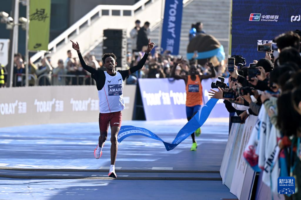 12月1日,厄立特里亚选手阿玛雷(前)在比赛中冲线。他以2小时06分26秒的成绩获得男子组冠军。