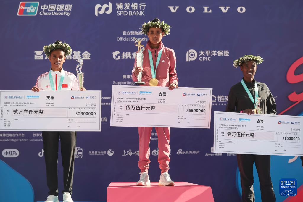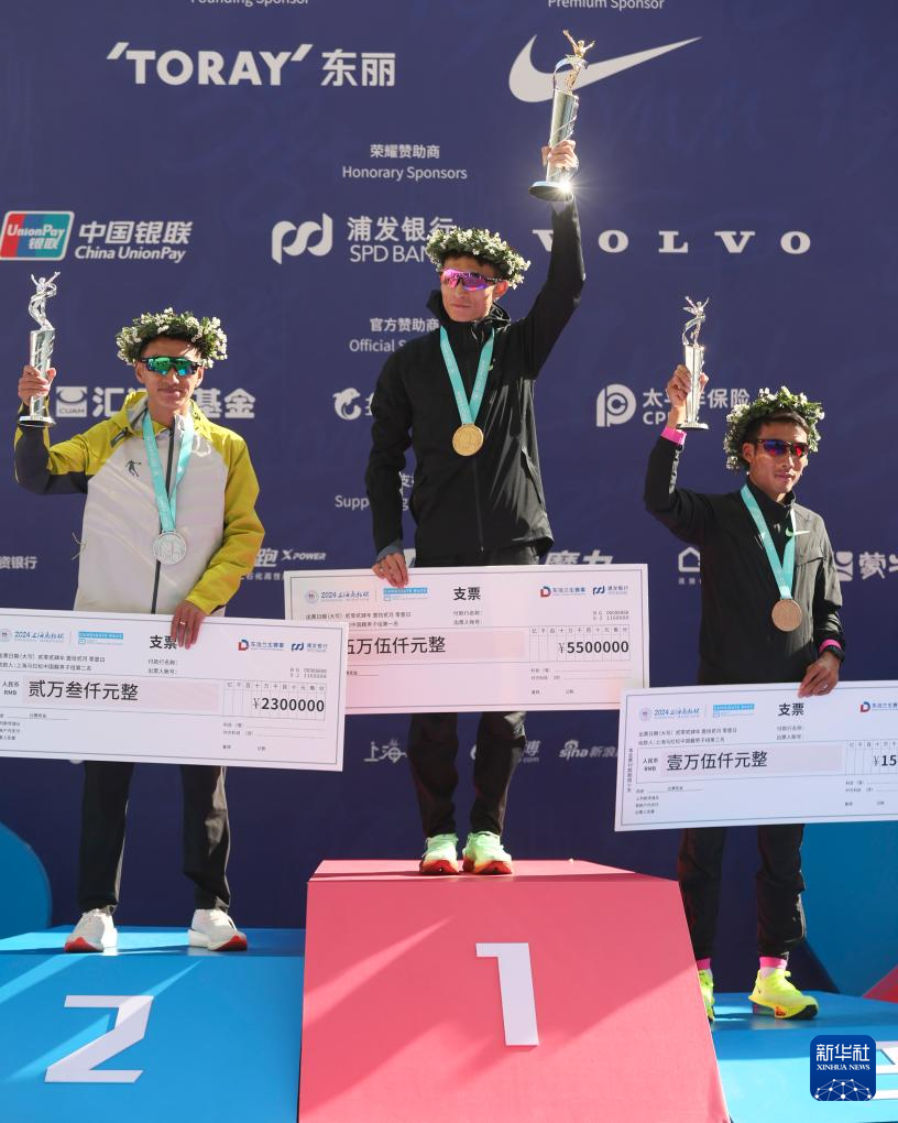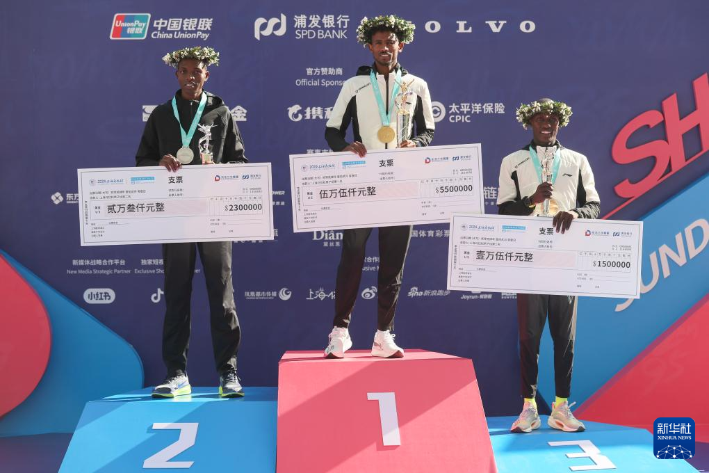 12月1日,冠军厄立特里亚选手阿玛雷(中)、亚军肯尼亚选手基普鲁托(左)和季军肯尼亚选手耶戈在男子组颁奖仪式上。
