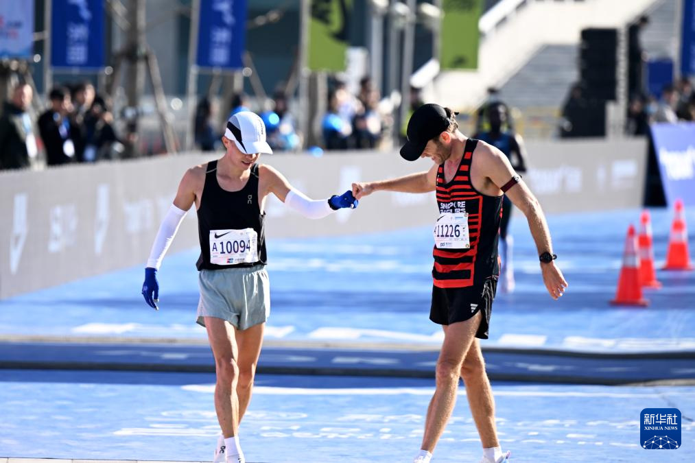 12月1日,参赛选手在冲过终点后互相击拳庆祝。