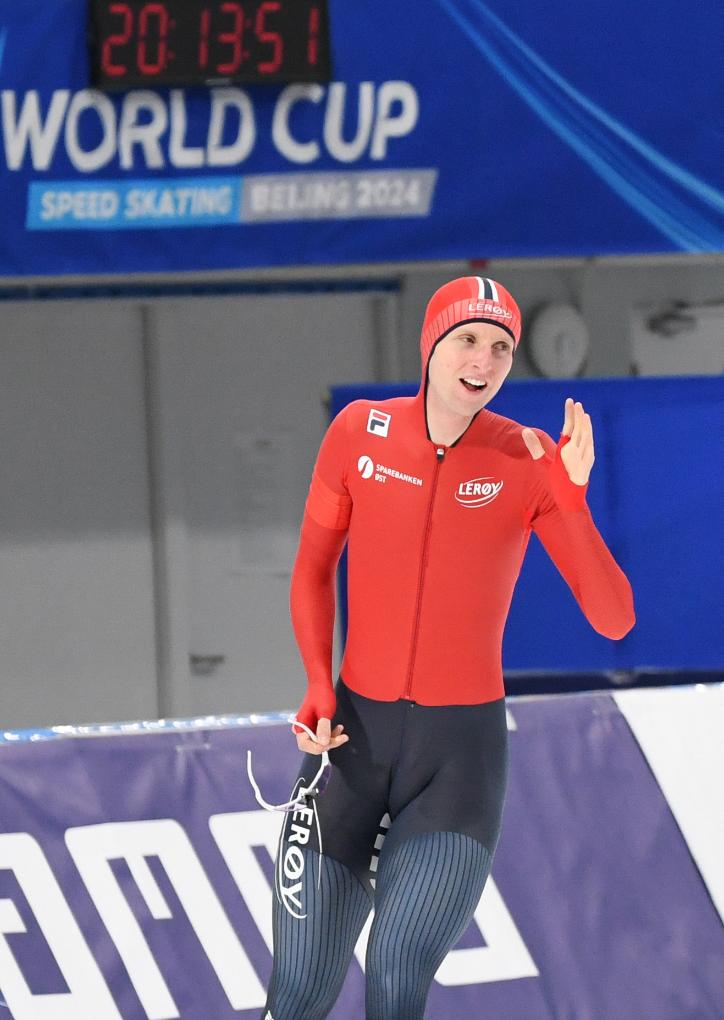 11月30日,挪威选手艾特雷姆在比赛后庆祝。他以6分09秒48的成绩获得金牌。