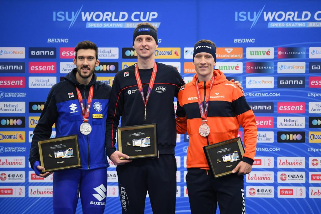 11月30日,获得金牌的挪威选手艾特雷姆(中)、获得银牌的意大利选手吉奥托(左)和获得铜牌的荷兰选手博·斯尼林克在颁奖仪式上。
