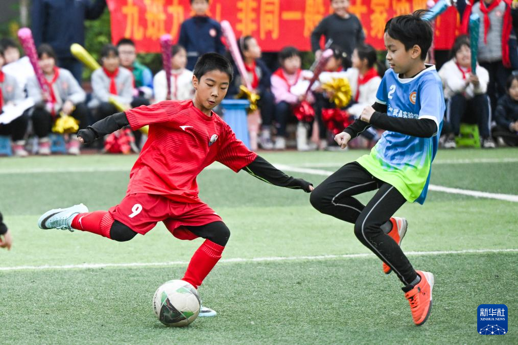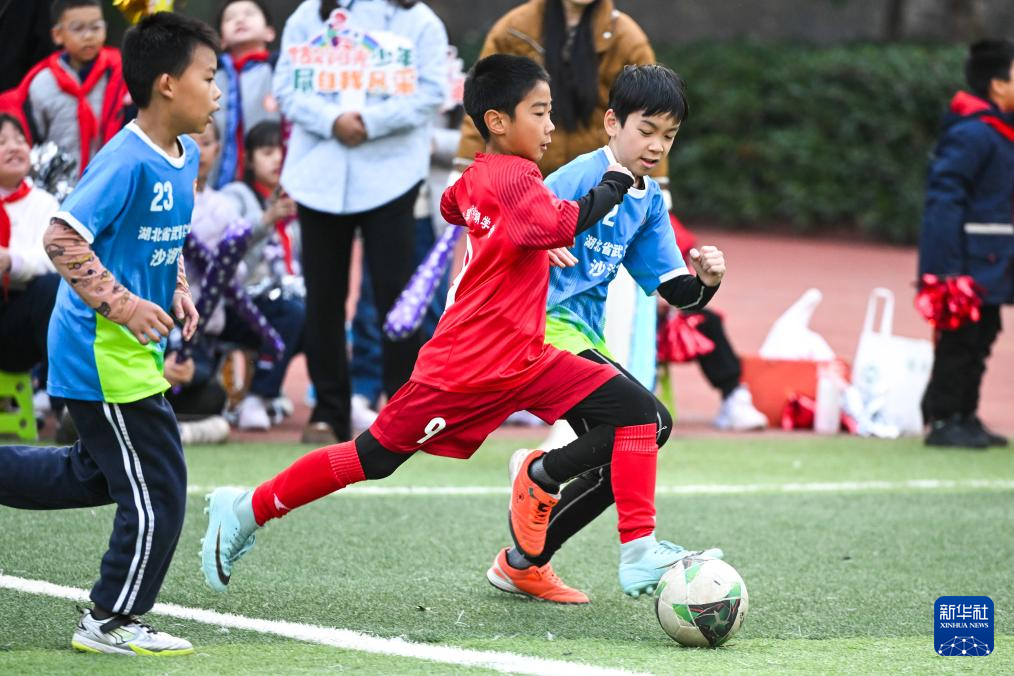 12月2日,湖北省武昌实验中学沙湖学校学生在四年级组足球联赛决赛中拼抢。