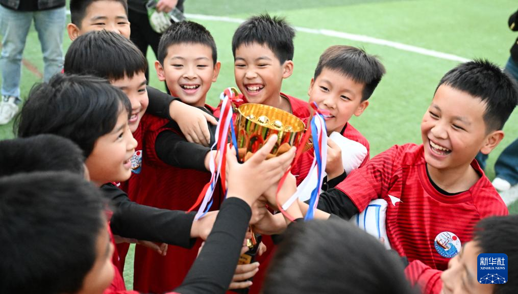 12月2日,湖北省武昌实验中学沙湖学校学生在四年级组足球联赛夺冠后庆祝。