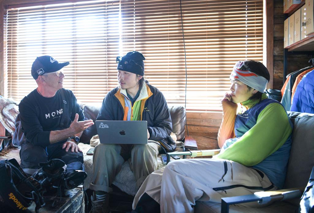 彭超(中)与好友彼得(左)在雪崩风险管理分享课上。新华社记者 胡虎虎 摄