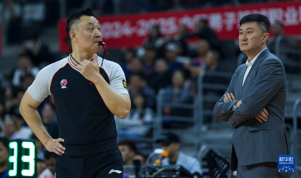 12月5日,广东东阳光队主教练杜锋(右)与裁判闫军在比赛中。