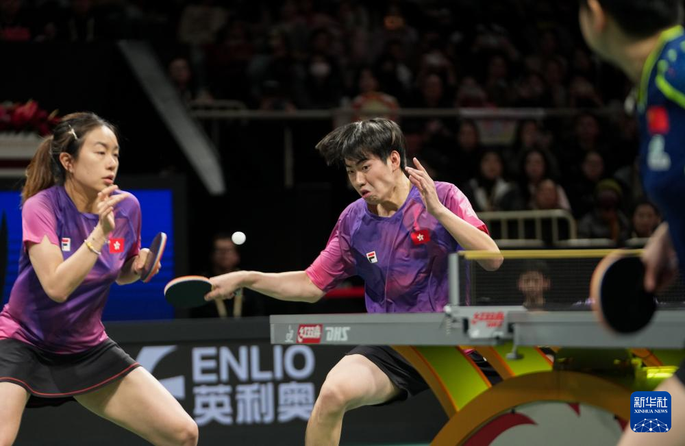 12月5日,中国香港队组合姚钧涛(右)/吴咏琳在混双比赛中。最终他们0比3不敌中国队组合王楚钦/孙颖莎。