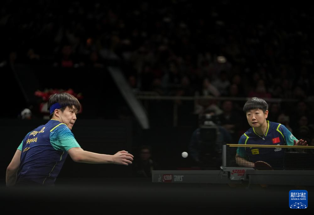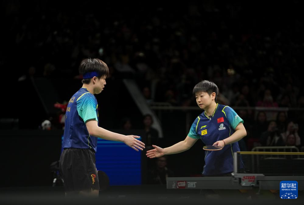 12月5日,中国队组合王楚钦/孙颖莎(右)在混双比赛获胜后击掌庆祝。最终他们3比0战胜中国香港队组合姚钧涛/吴咏琳。