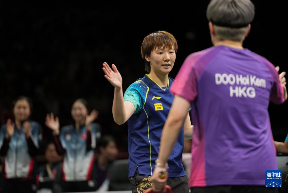 12月5日,中国队选手王曼昱(左)在女单比赛结束后与中国香港队选手杜凯琹击掌。最终她3比0获胜。