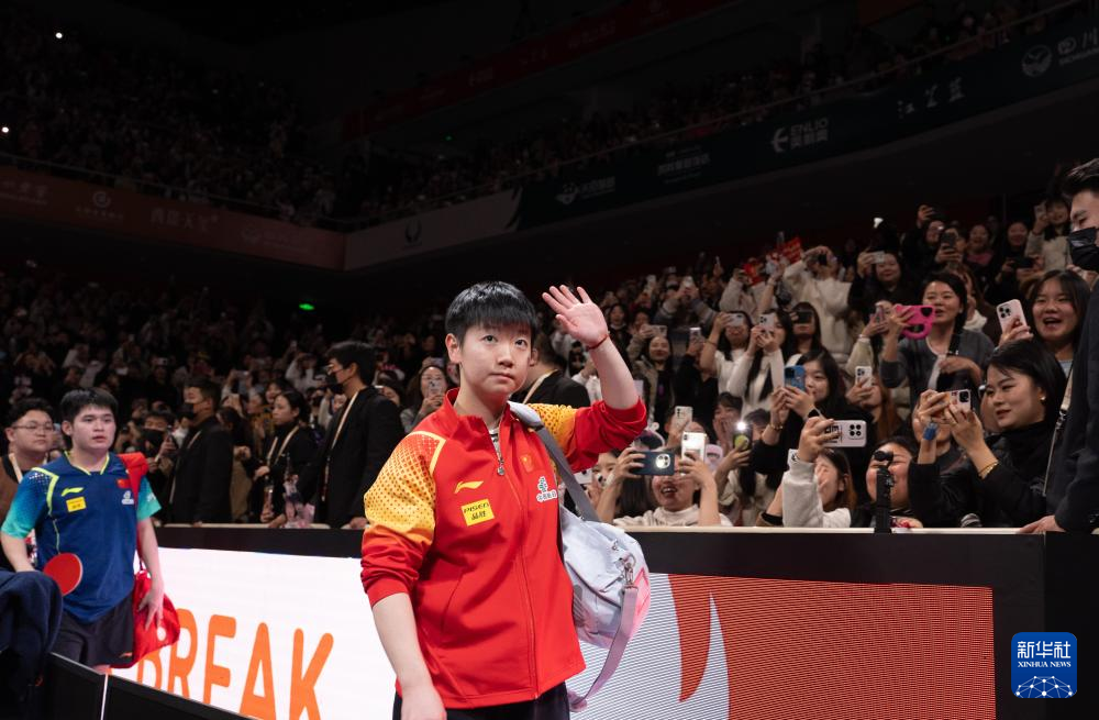 12月5日,中国队选手孙颖莎(中)赛后向观众挥手致意。