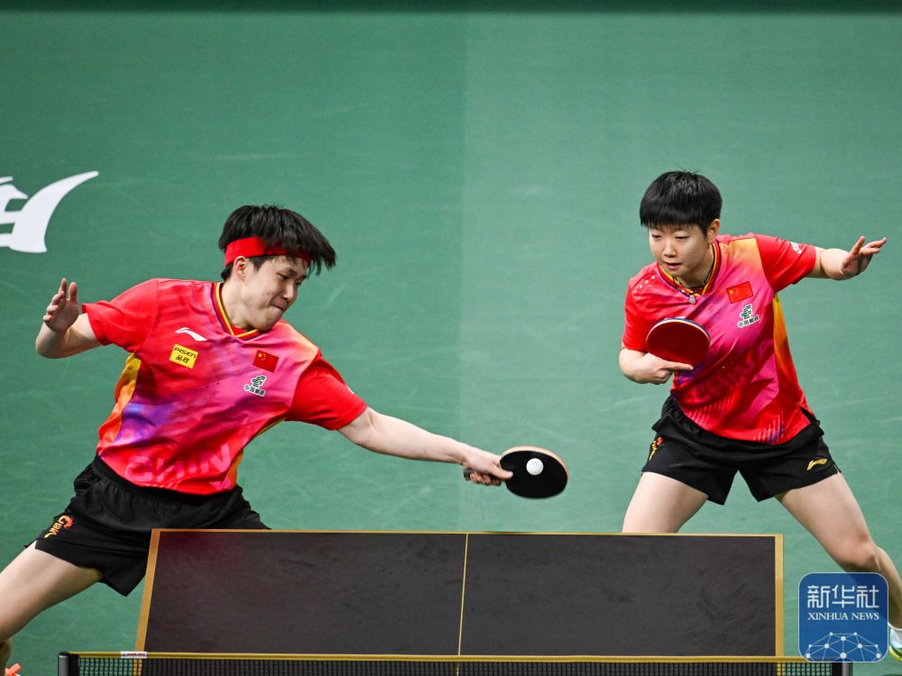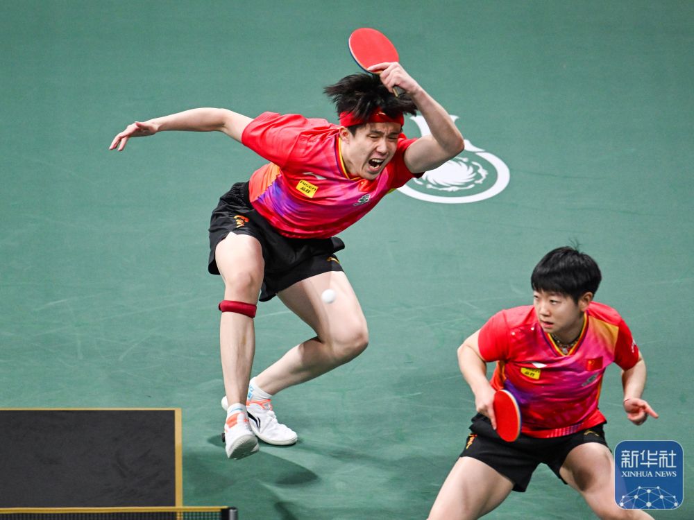 ↑中国队组合王楚钦(左)/孙颖莎在混双比赛中。新华社记者 王曦 摄