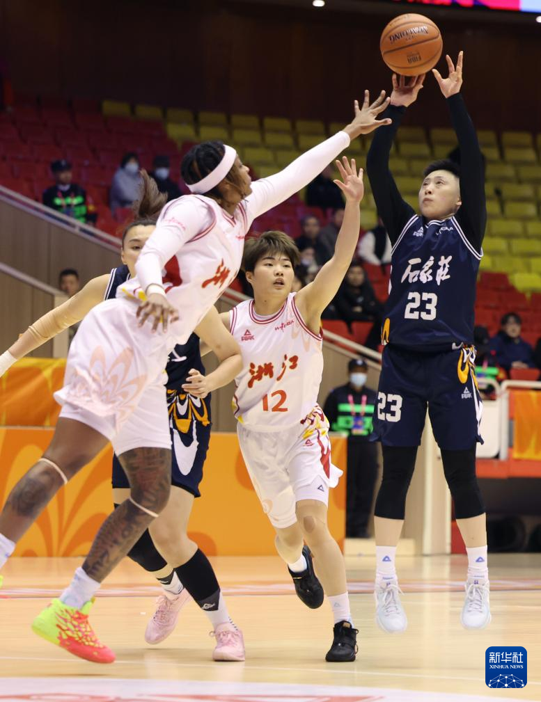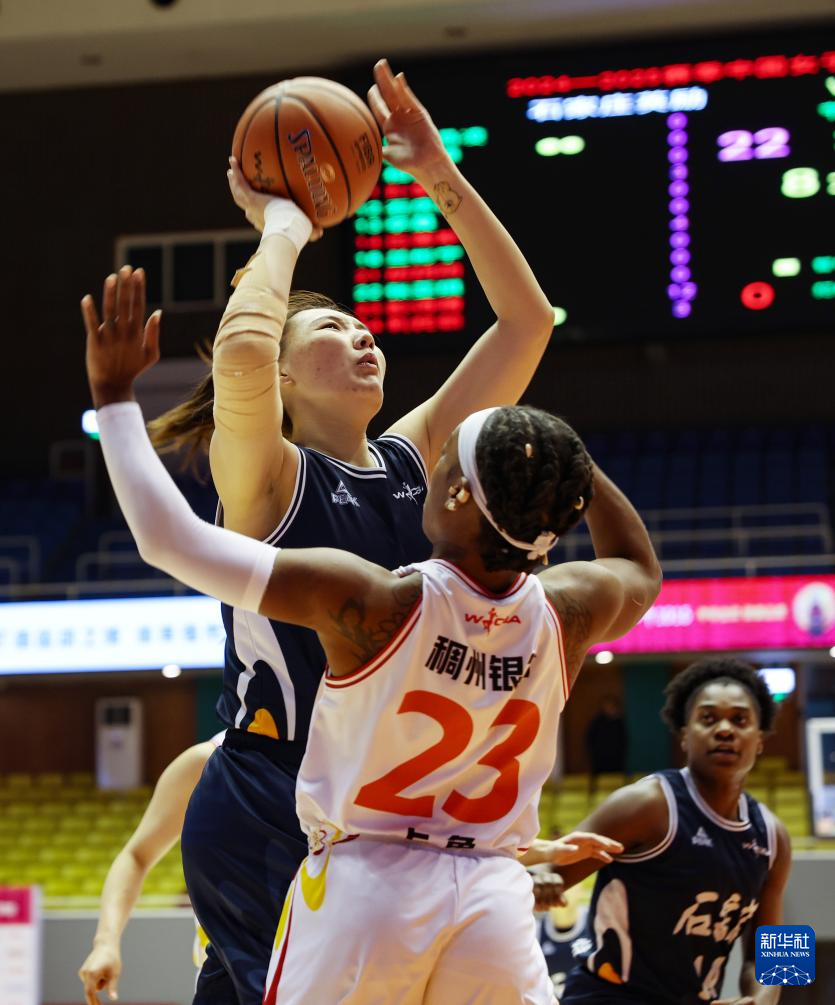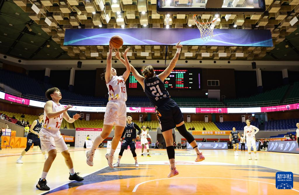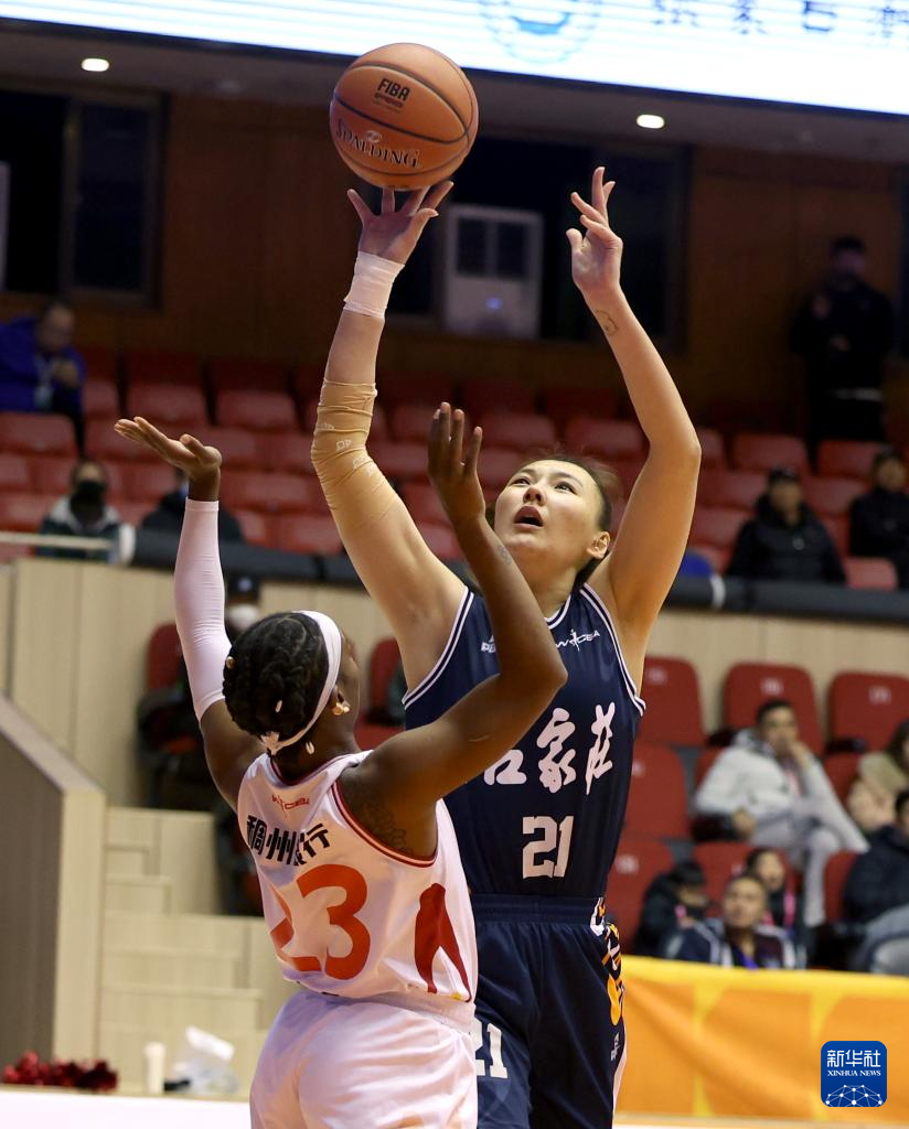 12月8日,石家庄英励队球员彭诗晴(右一)在比赛中投篮。