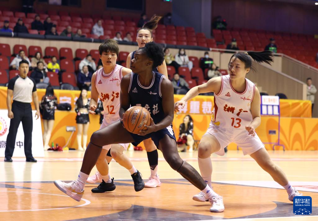 12月8日,石家庄英励队球员崔妮蒂·艾森斯·巴蒂斯特(中)在浙江稠州银行队球员张敏(右)的防守下带球进攻。