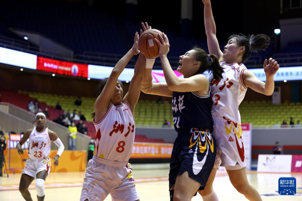 12月8日,石家庄英励队球员胡玥明(右上)与浙江稠州银行队球员张敏(左上)在比赛中争抢篮板球。