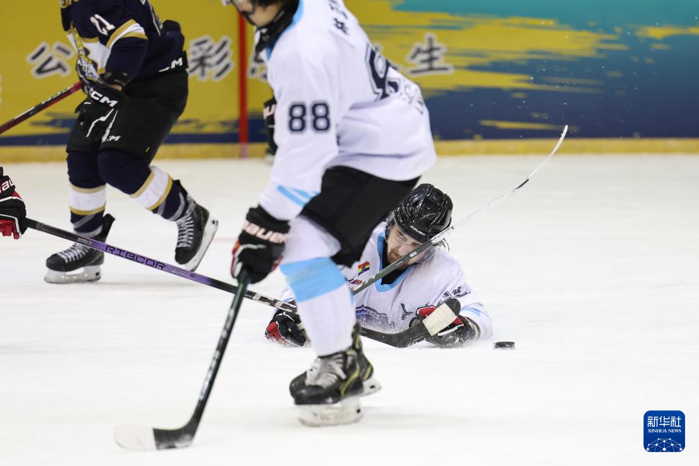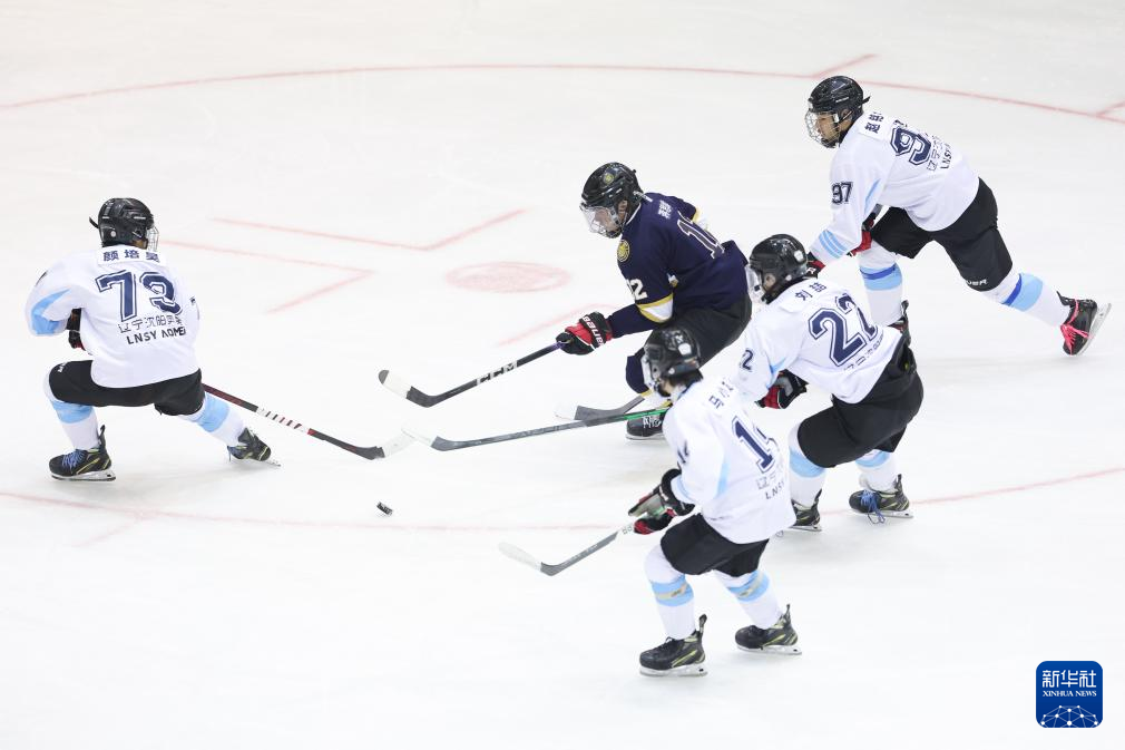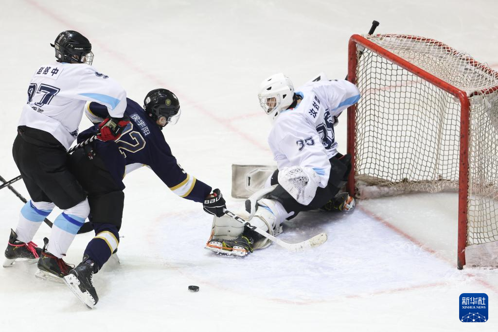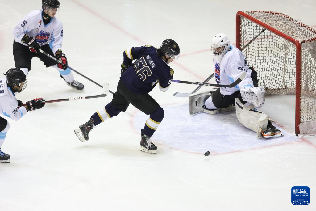 12月8日,北京京狮男子冰球队球员张泽森(右二)在比赛中射门。