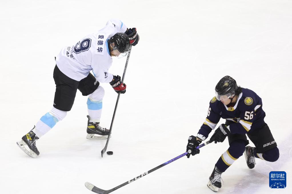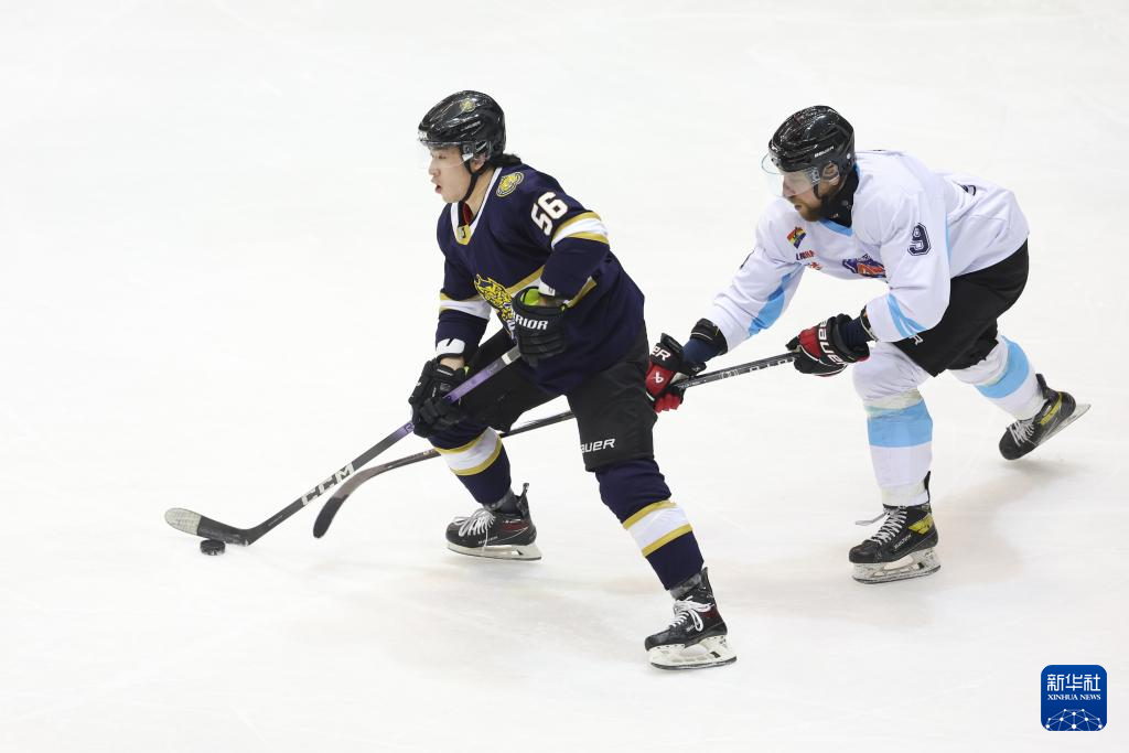 12月8日,北京京狮男子冰球队球员张泽森(左)在比赛中突破。