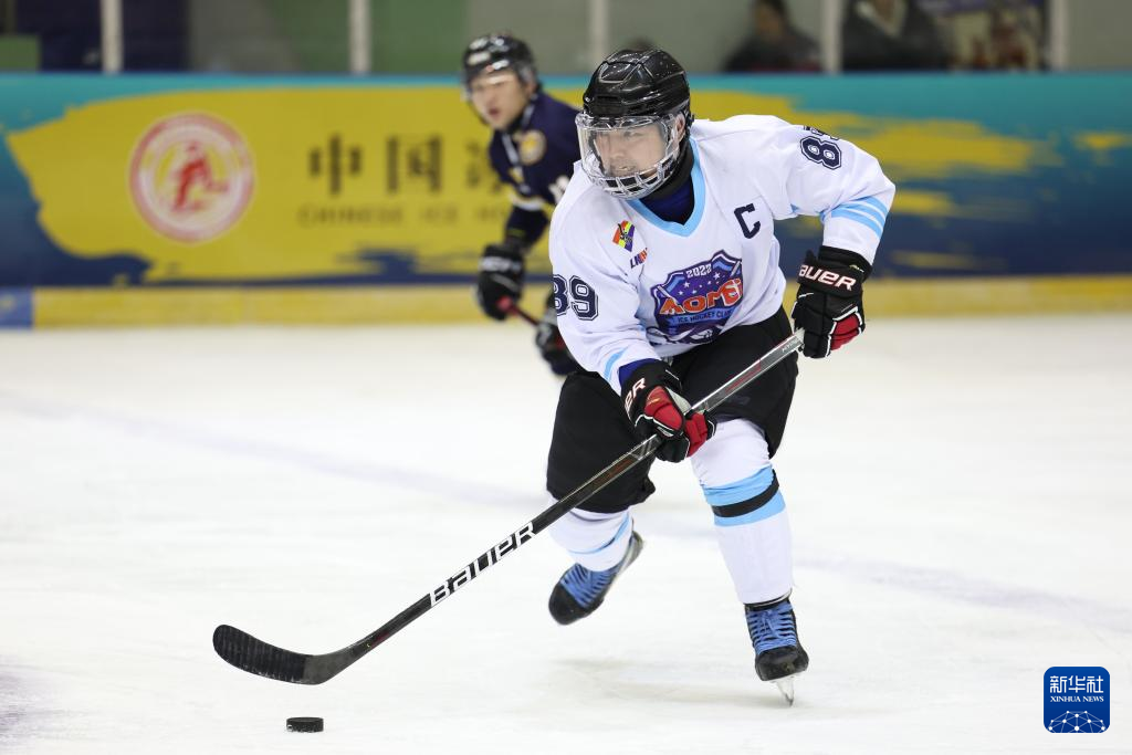 12月8日,辽宁沈阳奥美冰球俱乐部队球员郭鑫在比赛中带球。