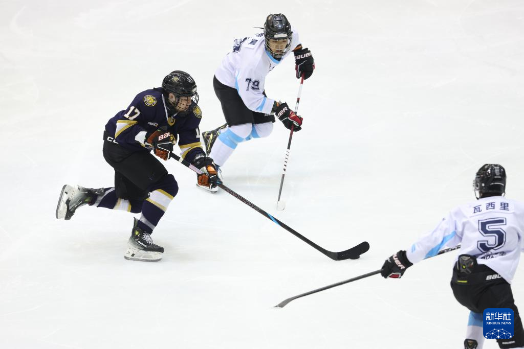 12月8日,北京京狮男子冰球队球员蒋思雄(中)在比赛中突破。