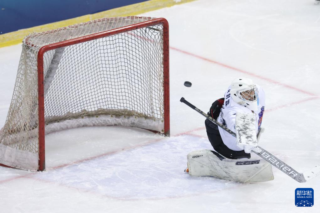 12月8日,辽宁沈阳奥美冰球俱乐部队守门员汝封霖在比赛中防守。