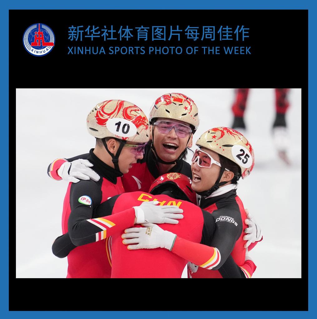 12月8日,中国队选手刘少昂(左)、刘少林(后)、李文龙(右)和孙龙在比赛结束后庆祝。