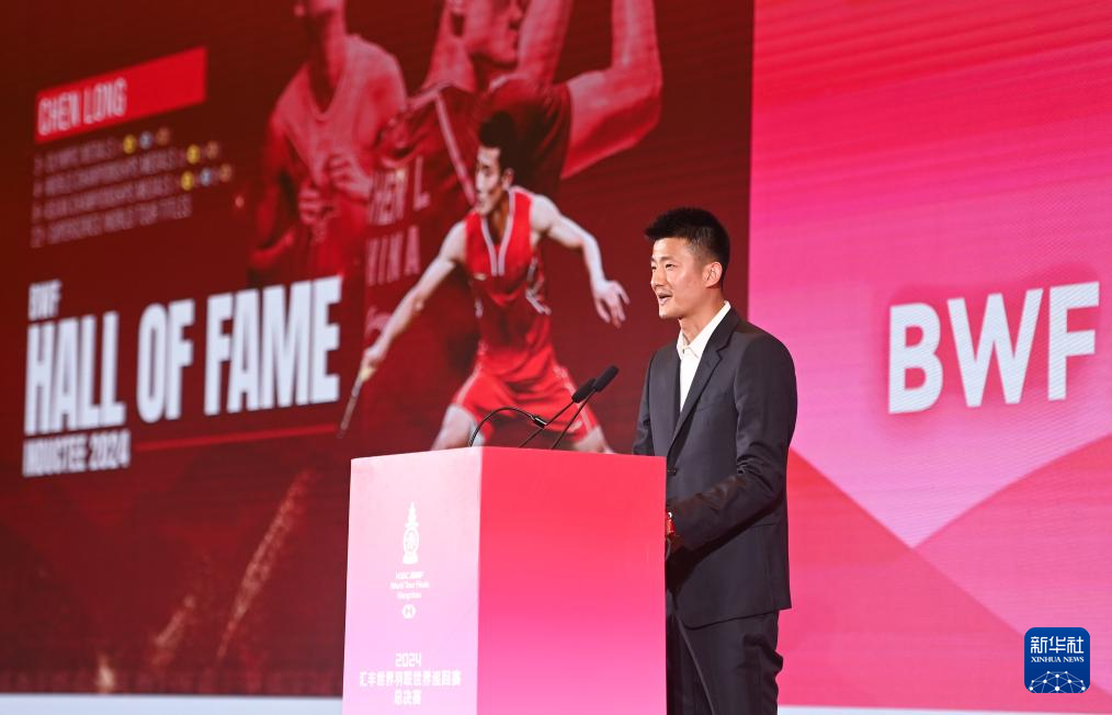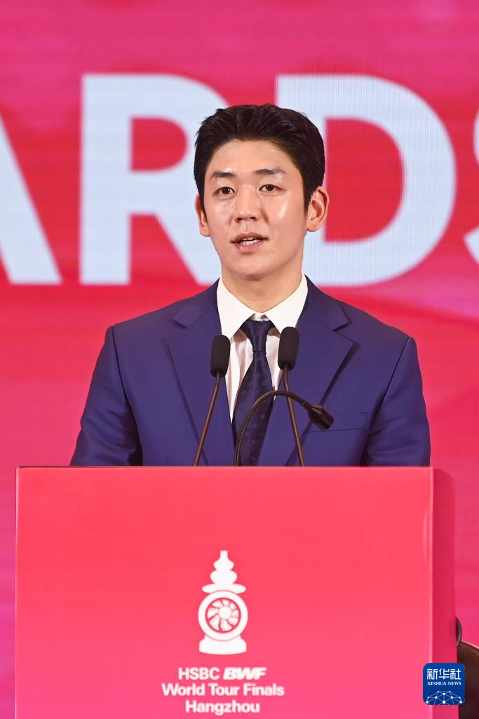12月9日,入选世界羽联名人堂的奥运冠军、中国羽毛球队前队员谌龙在颁奖典礼上发言。