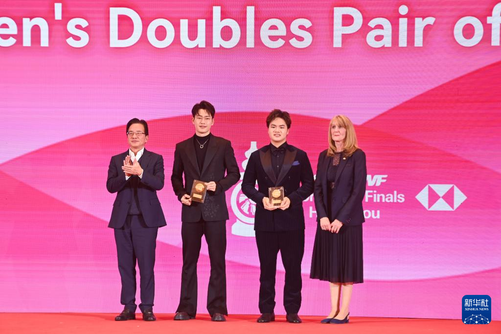12月9日,获得年度最佳男子双打组合的中国组合梁伟铿(右二)/王昶(左二)在颁奖典礼上。