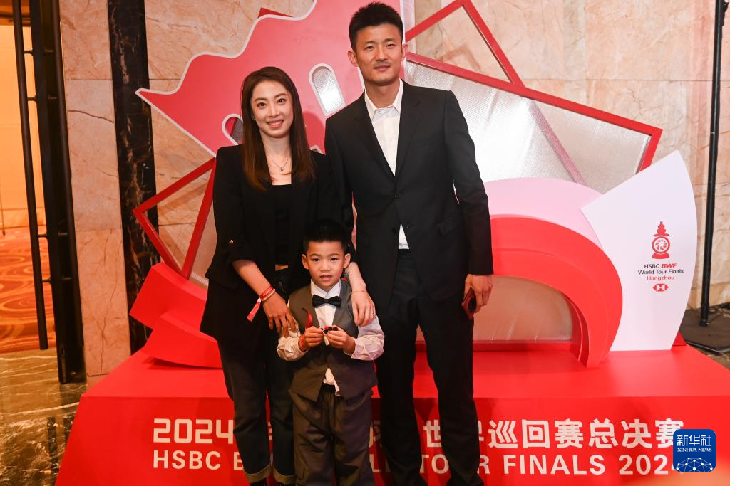 12月9日,入选世界羽联名人堂的奥运冠军、中国羽毛球队前队员谌龙(右)携妻子王适娴(左)、儿子在欢迎晚宴举行前留影。